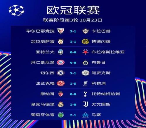 10月23日凌晨,欧冠联赛阶段第3轮比赛再赛9场。在一场强强对话的比赛当中,皇马1-0小胜尤文图斯。利物浦队在客场用一场5-1的大胜,结束了此前的各项赛事4连败。同样取得大胜的还有拜仁和切尔西。