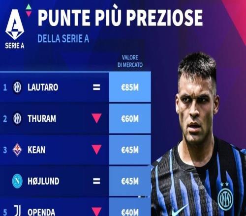 德转列意甲中锋身价前10:劳塔罗8500万第1,霍伊伦4500万第3 -